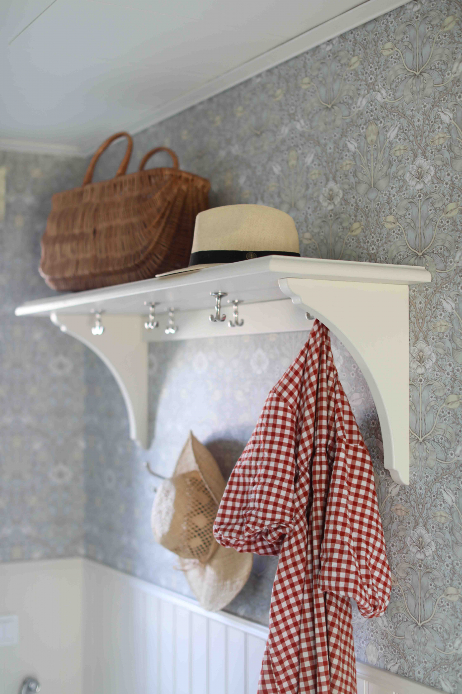 Hatthyllan Valter levereras med 6 st ankarkrok som kan beställas i guld eller silver. Kommer finnas i olika kulörer som vit, pärlgrå, jugndgrön och vetegrå
