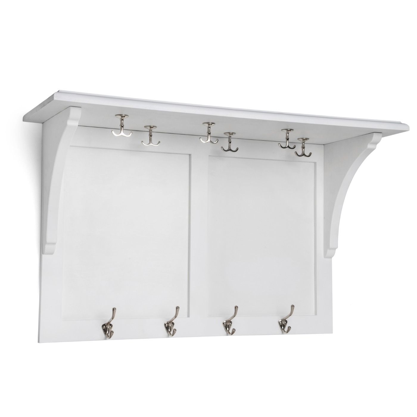 Hatthyllan Hilda levereras med 6 st ankarkrok som kan beställas i guld eller silver samt 4 klädkrokar. Kommer finnas i olika kulörer som vit, pärlgrå, jugndgrön och vetegrå