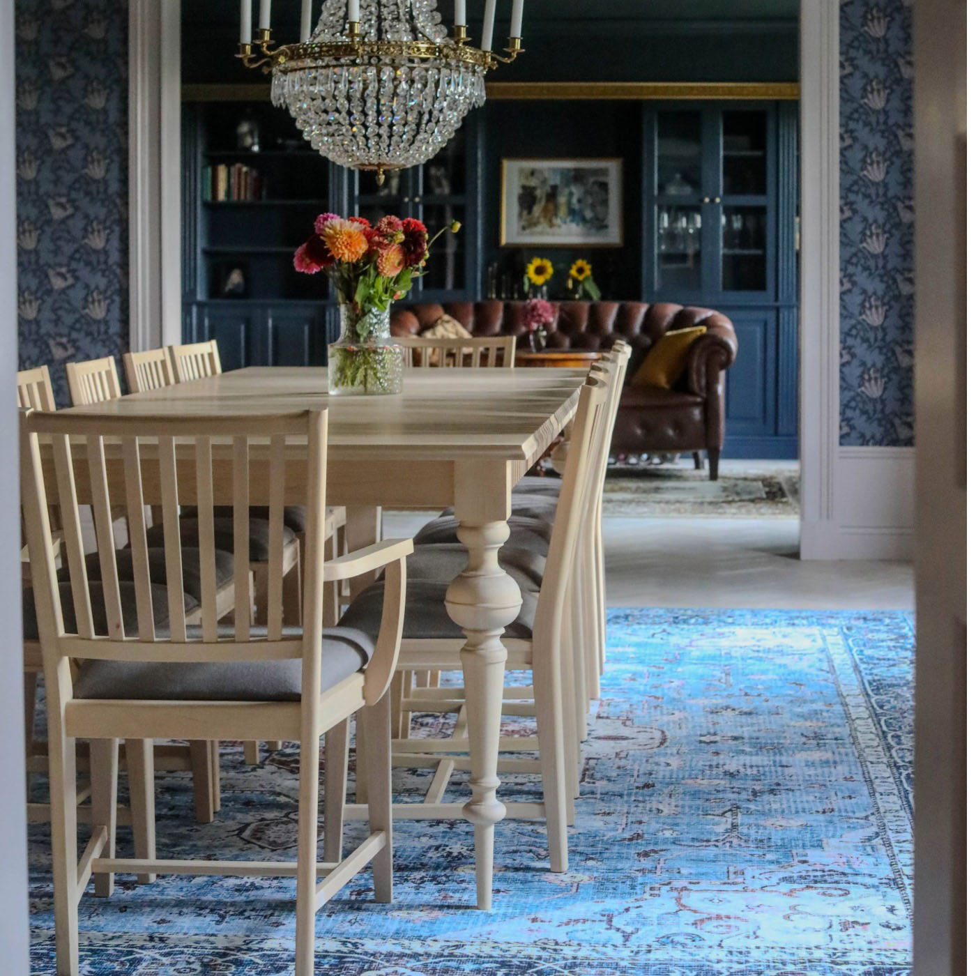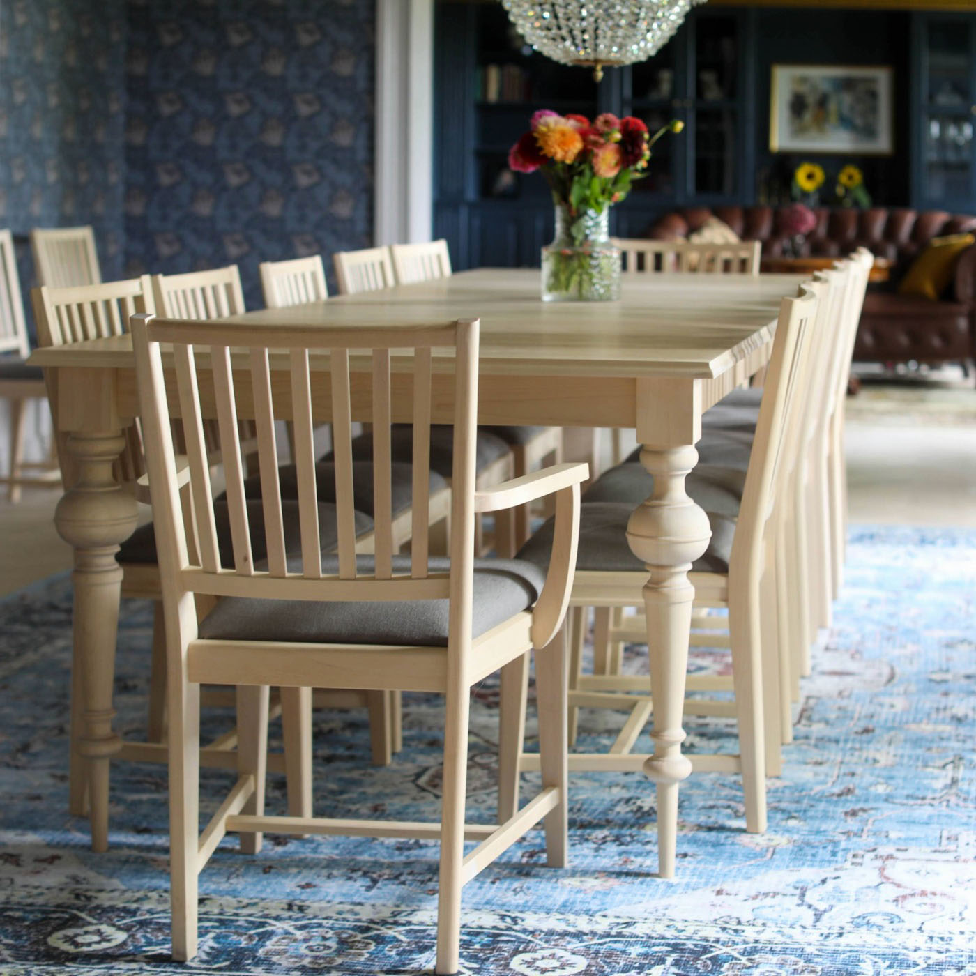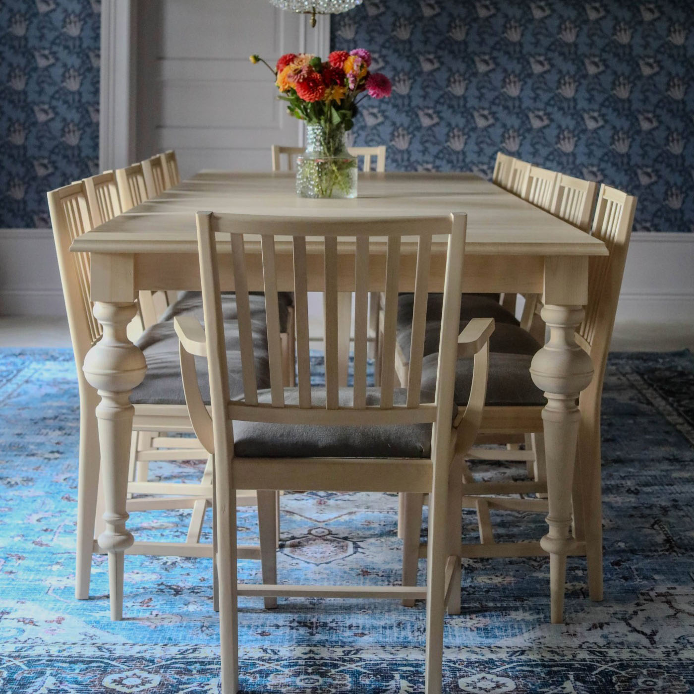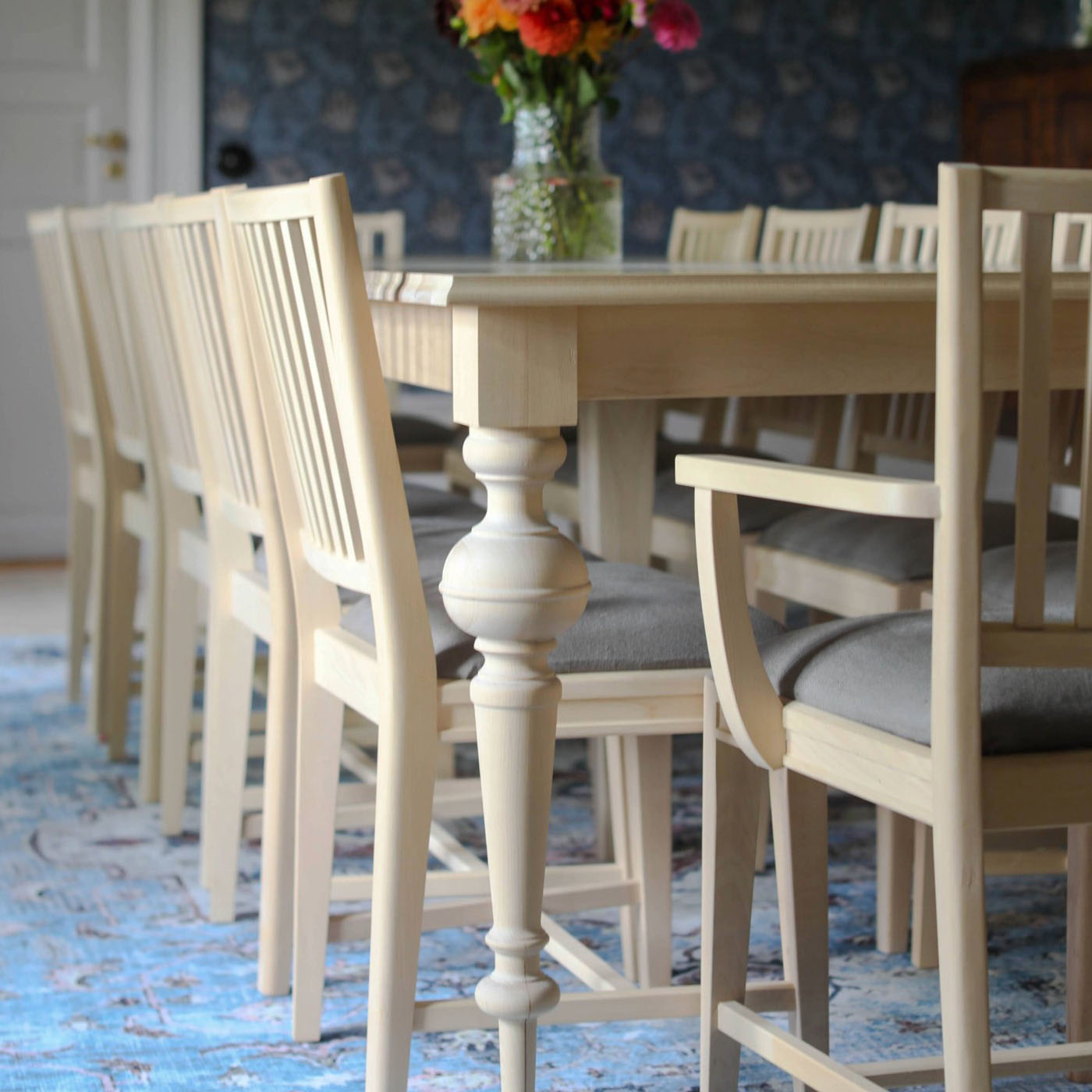 Elegant och gediget matbord i Carl Larsson-stil, tillverkat med inspiration från sekelskiftets möbeltradition. Alvar är ett hantverksmässigt nytillverkat bord med vackert svarvade ben, framtaget i samarbete med lokala snickare i Skaraborg.